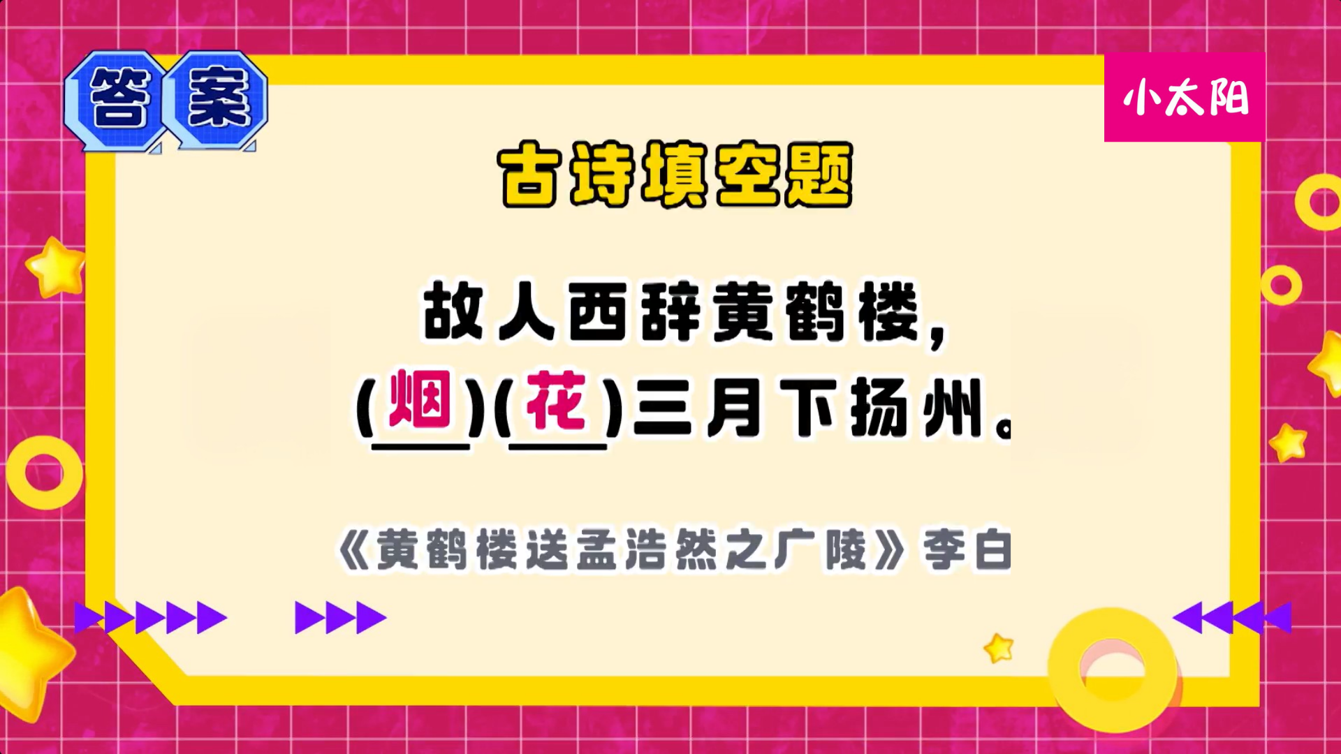 Astro 小太阳 我是三语王 | 华文篇 Astro XTY 30/03/2026 | 17:00 MYT 🖌️古诗填空题上线啦!相信同学们都知道著名诗人李白,这次就考考你们李白的诗吧!你知道应该在空格中填上什么字吗?想好答案了吗?滑下去看看正确答案✨。 。。。。。。。。。。答案: 烟花古诗意思:老朋友要告別黄鹤楼向东远行,在这风景像烟花一样艳丽的三月去扬州。小小诗人是你吗?快来挑战下一题!Rock it, Kiddo! S2《冲吧!智勇者 S2》💻 Astro GO / 小太阳 On Demand 随时点播精彩内容 🌟📲 下载 Sooka App 免费收看 你可能会喜欢 年饼 2026 CNY Biscuit | New Year Cookies Skechers Unisex CNY Short Sleeve Tee 100PLUS ZERO Golden Tangerine Bundle [240ml X 12] CNY Gift Set Giftbox 新年礼盒 年饼 送礼 2026 Creative ATM Pull Out Red Packet Cute Butter Bear 相关话题 #我是三语王 必看影片 Read more