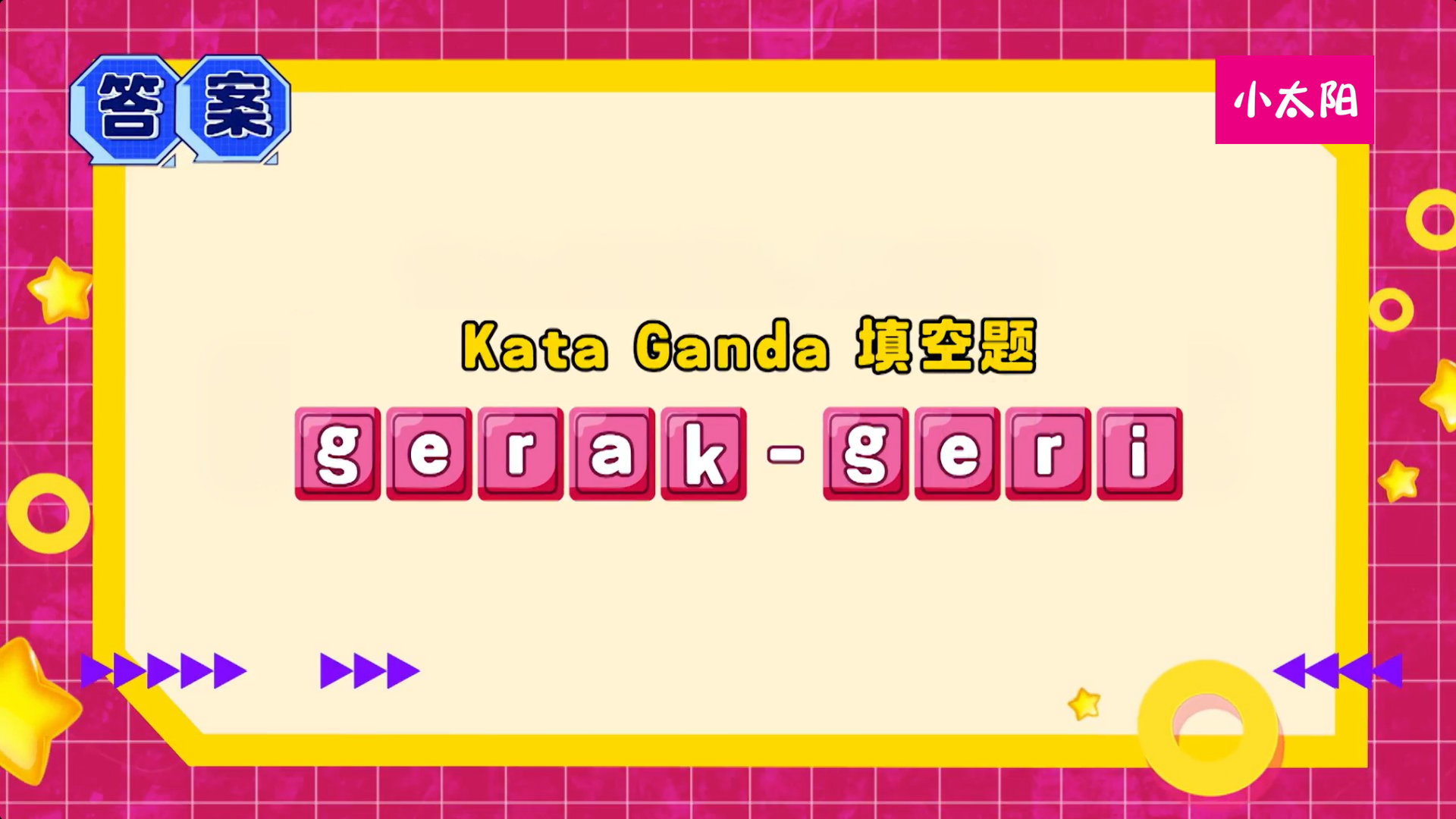Astro 小太阳 我是三语王 | 国文篇 Astro XTY 17/03/2026 | 10:29 MYT Kata Ganda 填空题✏️你知道gerak的重叠词是什么吗?有4个字母哟!动动脑筋,填上正确的词语吧!填好了吗?答案揭晓啦✨。 。。。。。。。。。答案: gerak-geri指的是一个人的动作,举动和行为举止。答对的同学们,你们的Bahasa Melayu真的很不错哦!👏Rock it, Kiddo! S2《冲吧!智勇者 S2》💻 Astro GO / 小太阳 On Demand 随时点播精彩内容 🌟📲 下载 Sooka App 免费收看 你可能会喜欢 CNY Gift Set Giftbox 新年礼盒 年饼 送礼 2026 100PLUS ZERO Golden Tangerine Bundle [240ml X 12] Creative ATM Pull Out Red Packet Cute Butter Bear Skechers Unisex CNY Short Sleeve Tee 年饼 2026 CNY Biscuit | New Year Cookies 相关话题 #我是三语王 必看影片 Read more