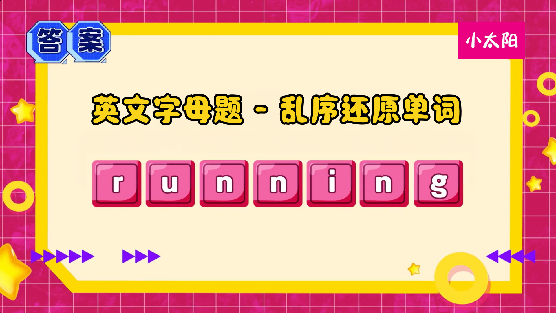 Astro 小太阳 我是三语王 | 英文篇 Astro XTY 08/04/2026 | 09:00 MYT 乱乱的字母:u r n n n g i 你能从这一些被打乱的字母中,还原正确的单词吗?这是一个常见的verb (动词),你每天可能都会做的动作哟!答案揭晓✨。 。。。。。。。。。。答案: running意思:跑你答对了吗?给自己点一个赞👍Rock it, Kiddo! S2《冲吧!智勇者 S2》💻 Astro GO / 小太阳 On Demand 随时点播精彩内容 🌟📲 下载 Sooka App 免费收看 你可能会喜欢 Lovito Casual Striped Lace Up Pattern Backless Spring/Summer Light Pink Tank Top for Women L136AD305 My Ballerine Jenny Comfy Sandals [Official] d'Alba_Store Italian White Truffle First Spray Serum 50ml&100ml Chuck's Prime Time Firming Ginseng + 0.2% Retinol Eye Cream POP MART PUCKY Tap Tap Babies Series-Vinyl Plush Pendant Blind Box 相关话题 #我是三语王 必看影片 Read more