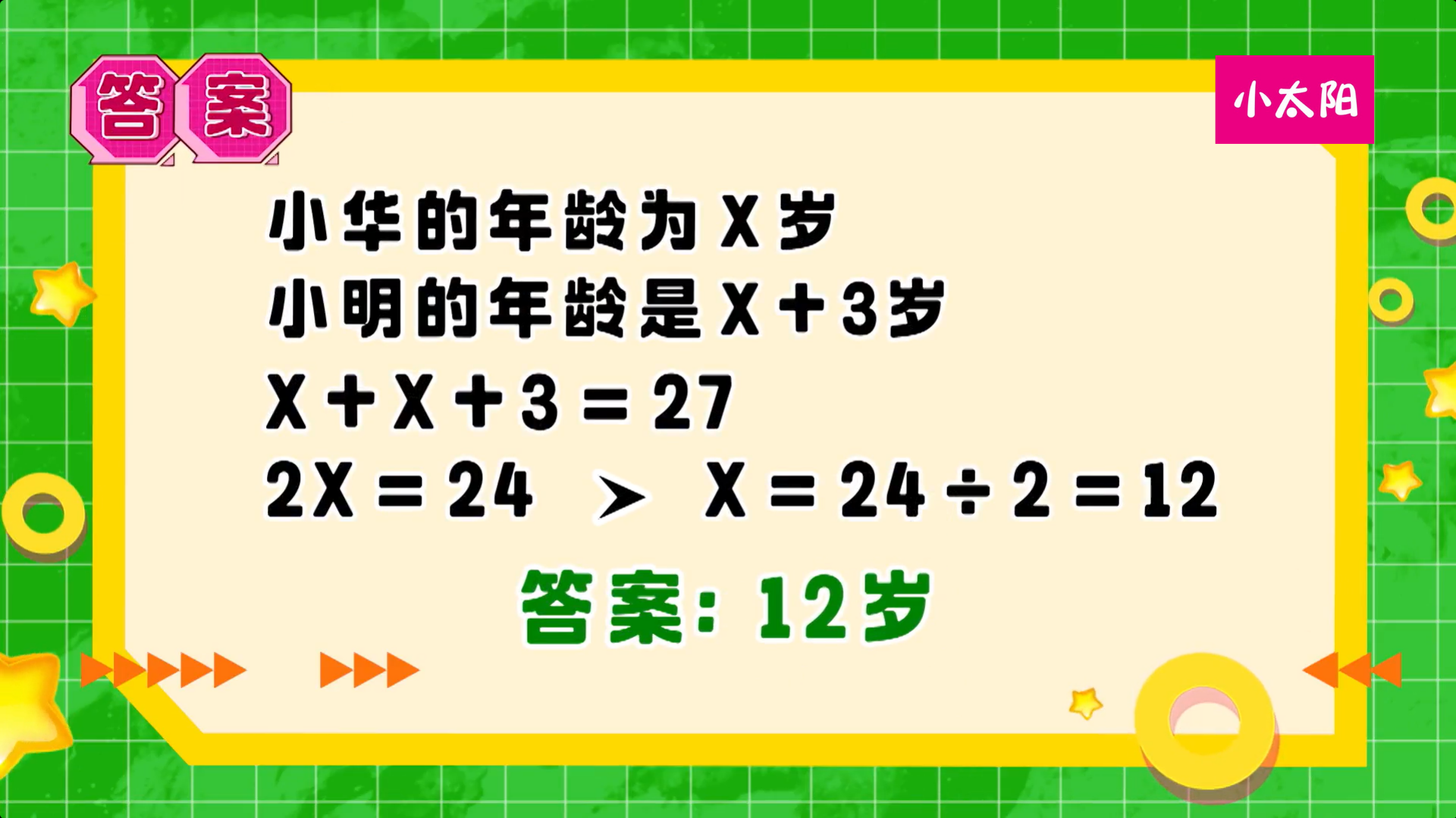 Astro 小太阳 数战数决 Astro XTY 19/03/2026 | 17:00 MYT 你能在一分钟内算出小华的岁数吗?💡小贴士:要知道小华几岁,首先必须算出小明几岁哟! 算好了吗?答案揭晓啦✨。。。。。。。。。。。答案: 12岁你答对了吗?数学达人就是你!答错的同学们,下一题再接再厉吧!Rock it, Kiddo! S2《冲吧!智勇者 S2》💻 Astro GO / 小太阳 On Demand 随时点播精彩内容 🌟📲 下载 Sooka App 免费收看 你可能会喜欢 Creative ATM Pull Out Red Packet Cute Butter Bear 100PLUS ZERO Golden Tangerine Bundle [240ml X 12] Skechers Unisex CNY Short Sleeve Tee 年饼 2026 CNY Biscuit | New Year Cookies CNY Gift Set Giftbox 新年礼盒 年饼 送礼 2026 相关话题 #数战数决 必看影片 Read more