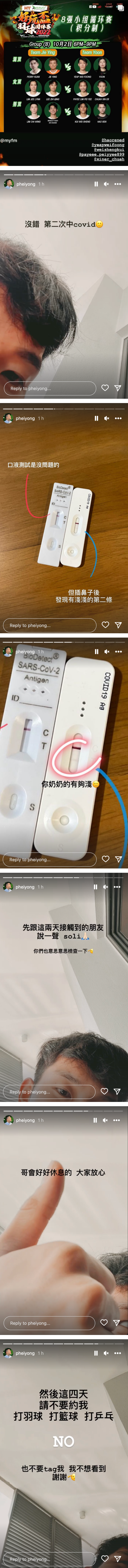 培永近日在《MY好玩盃羽球团体赛2022》(好玩盃)与Yoon吴家润、朱浩仁组队,并晒出了与大马女单吴堇溦一起进行训练的影片。没想到他今天(26日)直接在IG 上宣布,自己二度确诊新冠肺炎,“口液测试是没有问题的,但插鼻子后有深深的第二条”,让他无奈的表示:“请不要约我打羽球、篮球、乒乓,也不要TAG我,因为我不想看到!”