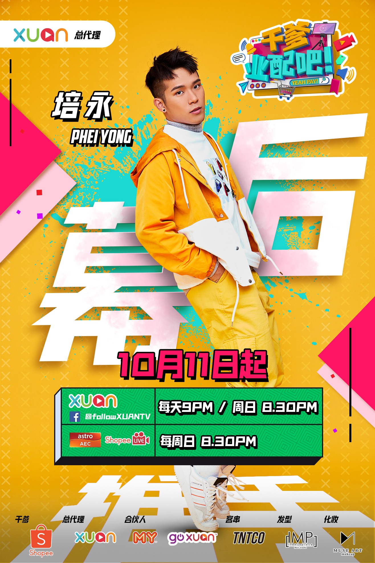 《干爹业配吧!》10月11日起,每天晚上9点、周日晚上8点30分,XUAN TV Facebook 播出;Astro AEC、Shopee LIVE 每周日晚上8点30分播出。