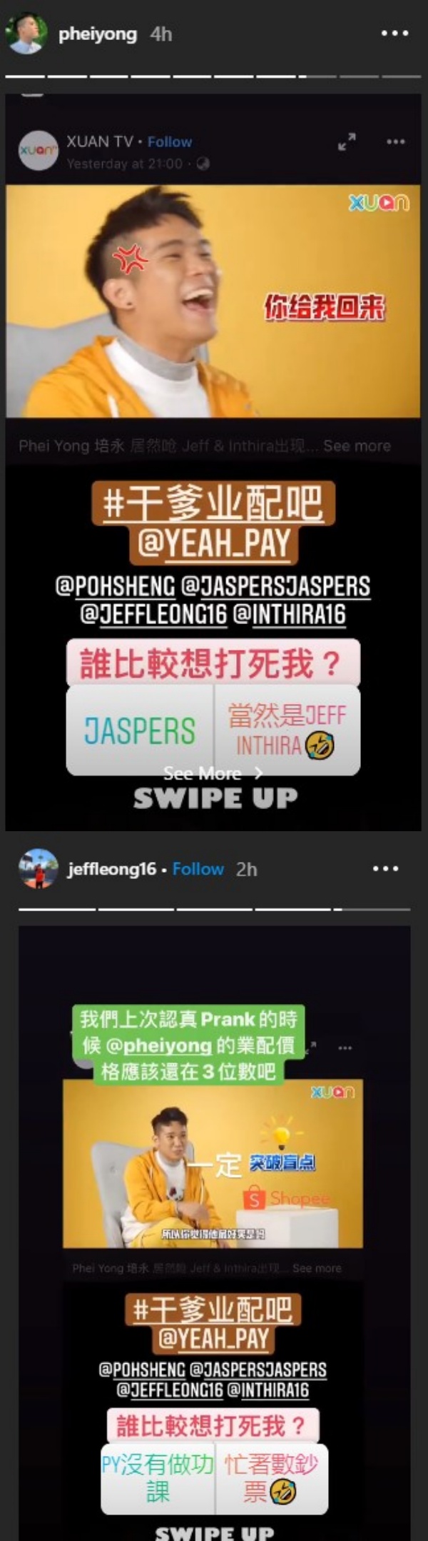 ▼ 培永暗讽Jeff&Inthira只会做prank,Jeff 在Instagram限时动态上反击,“我们上次认真prank的时候,培永的业配价格应该还在3位数吧” 唉哟,有火药味哦!
