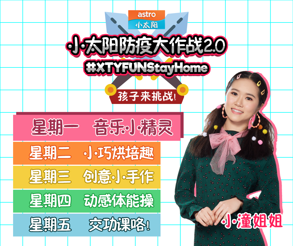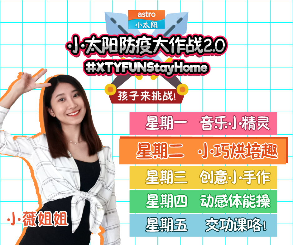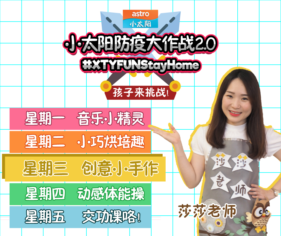 由小太阳精心策划的『小太阳防疫大作战2.0』来咯!这次有小太阳的姐姐们小潼、小可、小薇和大家熟悉的莎莎老师为大家精心制作多样化的教学视频,包括了《音乐小精灵》、《动感体能操》、《小巧烘培趣》和《创意小手作》!目的在于锻炼孩子大小肌肉和培养创意,简单而不需要太多器具或器材,简单的材料和几个步骤即可以让孩子独立完成,大大增加孩子们实现自我的自信心!