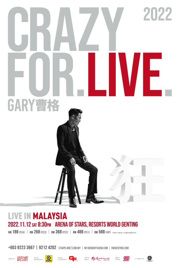 曹格《Crazy for LIVE》马来西亚演唱会2022,票价分别为RM588,RM488, RM368, RM268以及RM188(未含手续费)。门票将于2022年9月20日,下午2点于my.bookmyshow.com正式公开发售。更多详情,可以浏览主办单位Star Planet 星艺娱乐www.starplanet.com.my 或拨打热线 +603 9223 3667洽询。