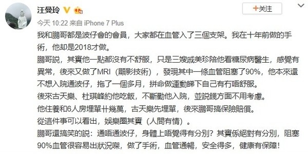香港传媒人汪曼玲在脸书上晒出她和鹏哥的合照,她说到两人都曾做通波仔手术。据悉,鹏哥当初得知血管塞了90%,他原本不想入院做手术,想说自己多做运动就行。