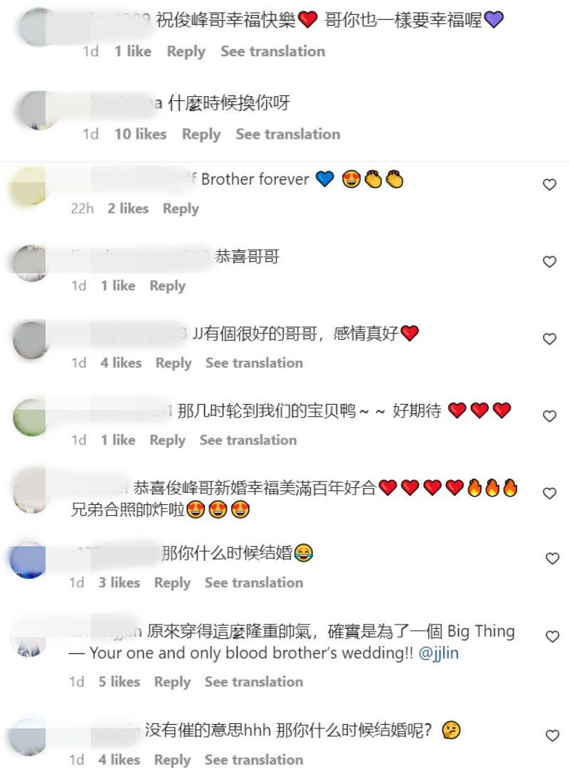 林俊杰祝贺哥哥新婚快乐的贴文曝光后,网友也留言催促问他何时找到自己的另一半,“什么时候换你呀”、“brother forever”、“兄弟合照帅炸啦”、“那你什么时候结婚”等。