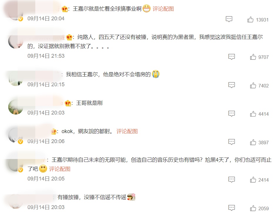 事情闹了几天,王嘉尔终于发声,粉丝看了之后替他护航说,“王嘉尔就是忙着全球搞事业啊”、“我相信王嘉尔,他是绝对不会塌房的”、“有锤放锤,没锤不信谣不传谣”等。