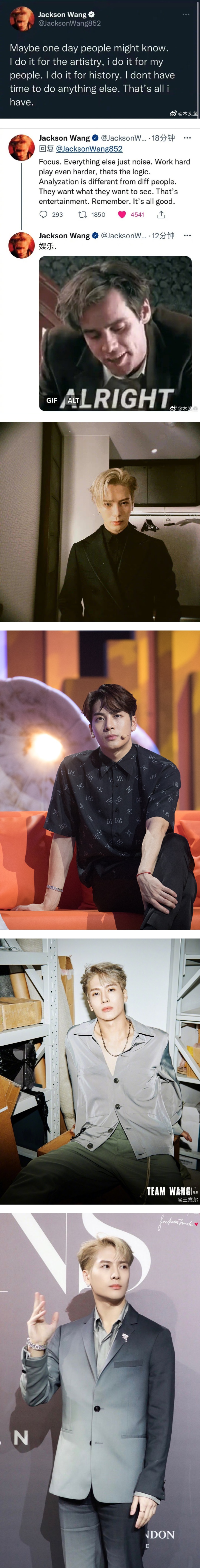 王嘉尔在推特上拥有英语发文写下,“也许有一天人们会知道,我做这些是为了艺术、为了我的粉丝、为了历史,我没有时间做其它事。这就是我所拥有的一切。保持专注,其它事情就都只是噪音,努力工作更要努力玩,逻辑就是如此。每个人的见解不同,他们只看到自己想看的,这就是娱乐。”