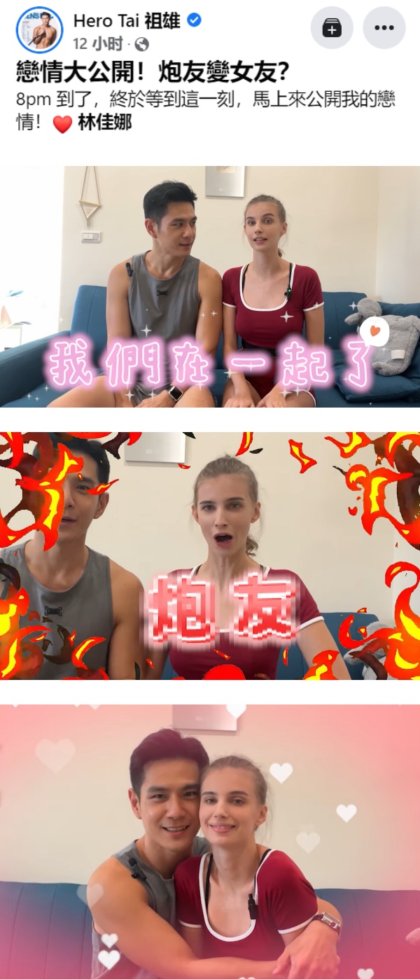 祖雄在FB上发布了和佳娜同框的视频配文,“终于到了这一刻,马上来公开我的恋情!”,文末他特地配上爱心emoji以及标签上佳娜的账号。