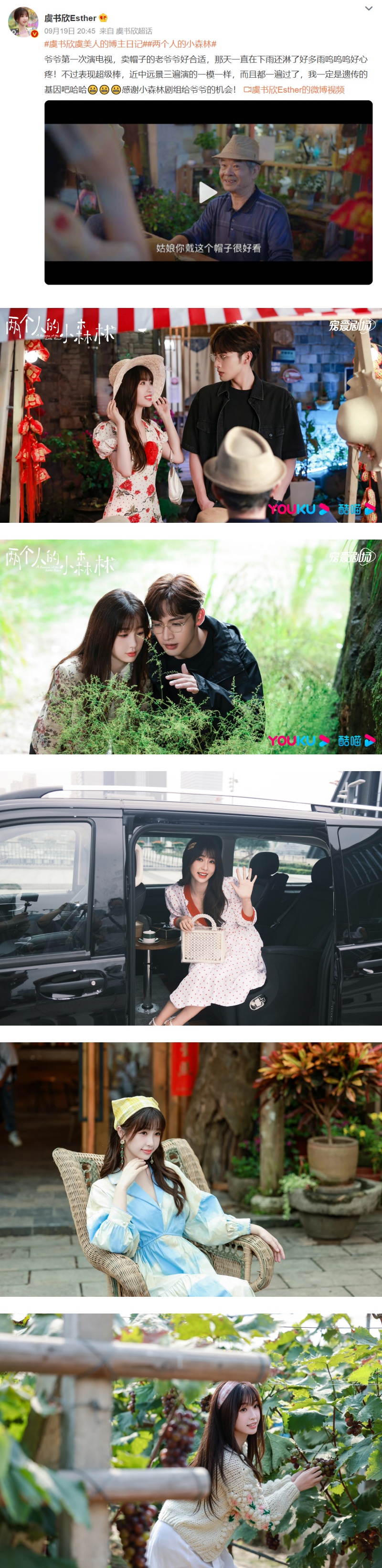 虞书欣在个人微博转发了这段片段写下,“爷爷第一次演电视,卖帽子的老爷爷好合适”,虞书欣大赞爷爷表现超棒,近中远景三个镜头拍摄都一take过,她自夸,“我一定是遗传的基因吧哈哈 感谢小森林剧组给爷爷的机会!”。