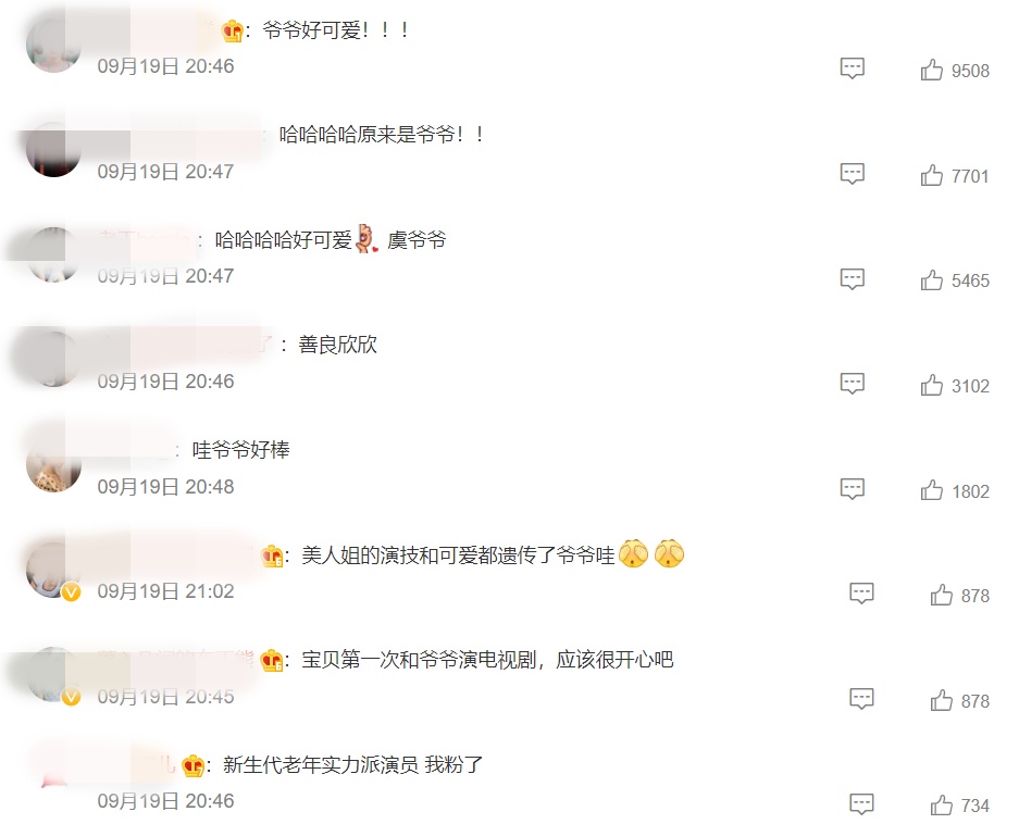 网友得知虞书欣的爷爷有份参与演出后大赞,“爷爷好可爱”、“新生代老年实力派演员 我粉了”、“美人姐的演技和可爱都遗传了爷爷哇”、“宝贝第一次和爷爷演电视剧,应该很开心吧”等。