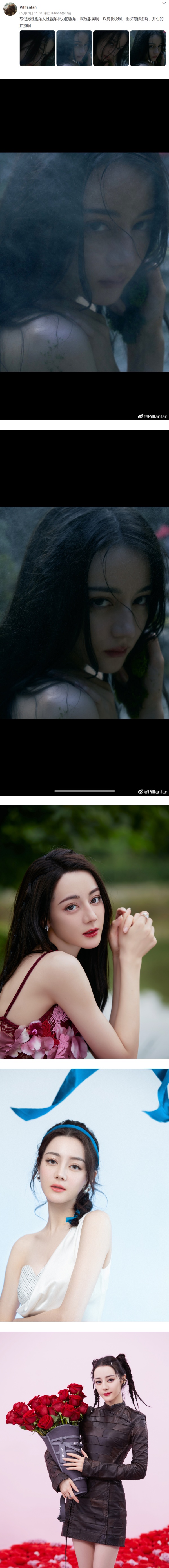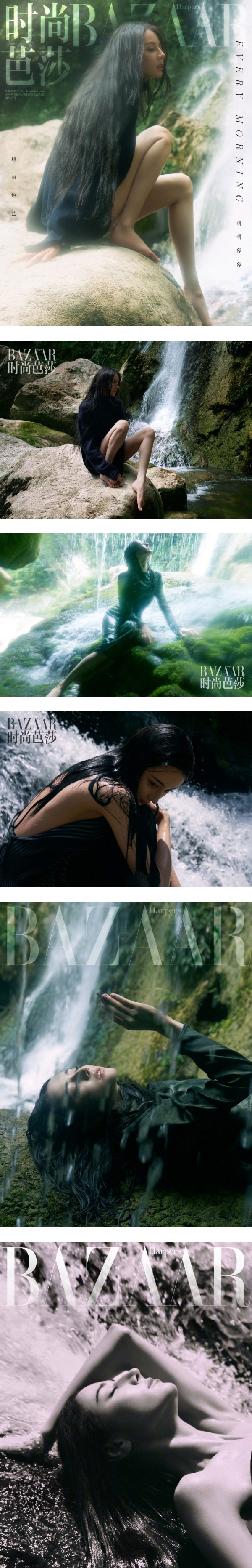 迪丽热巴为知名杂志《时尚芭莎》拍摄封面,摄影师特地把迪丽热巴带到户外,在瀑布下进行拍摄,迪丽热巴顶着一头乌黑长发坐在瀑布旁摆出各种撩人姿势。