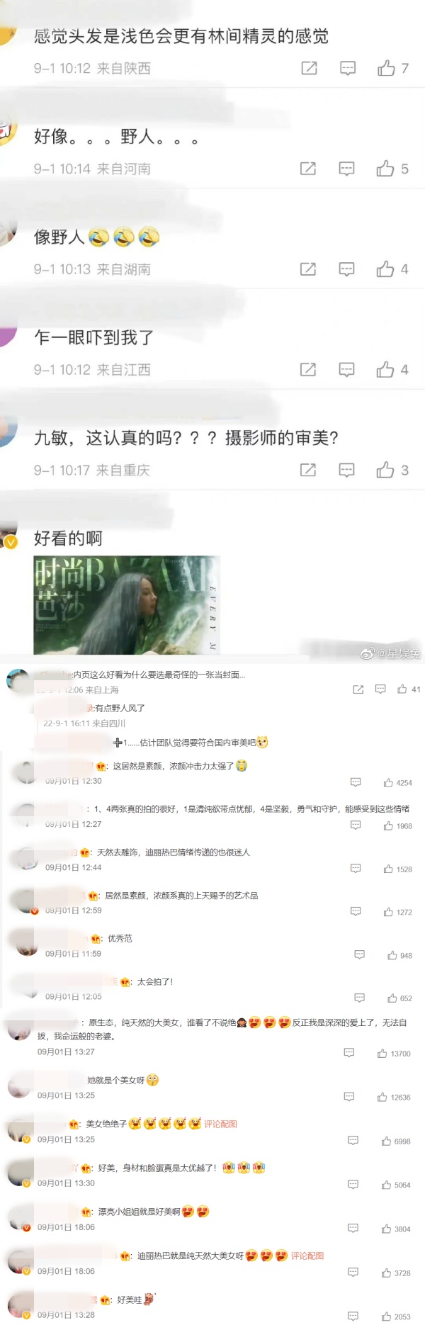 照片曝光后,有者却吐槽,“把美女拍成这样也挺不容易的”、“好像。。。野人”、“乍一看吓到我了”、“像野人”、“内页这么好看为什么要选最奇怪的一张当封面”等。