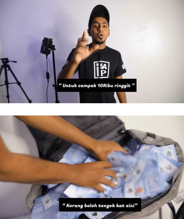 这位叫Farid Isap的网红特地换了1万令吉(10K)的RM1纸币,计划在闹区撒钱拍摄做挑战,希望能派钱给市民。随后,他大方向镜头展示10K一块钱的纸币,再对身边朋友邀约,以完成这项挑战。