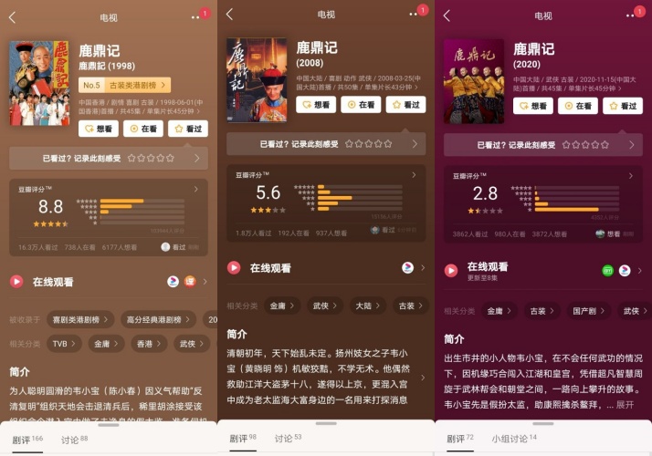 看了看豆瓣的评分,由陈小春主演的98年《鹿鼎记》被评为8.8分,2004年黄晓明的版本则为5.6分,2020年新版却只有2.7分。