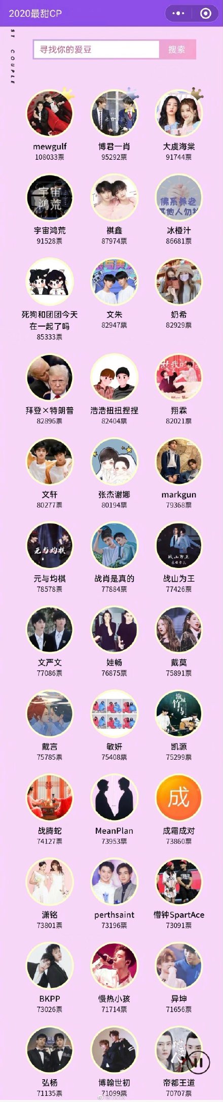 让人意外的是,中国网友竟也把即将卸任的美国总统特朗普,及继任总统拜登组成CP,并以8万多张票闯入第10名。