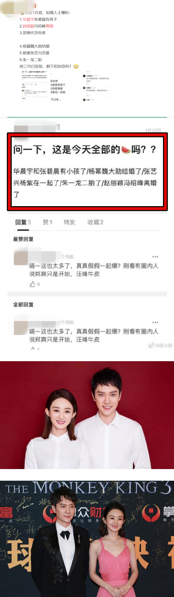 艺人赵丽颖和冯绍峰宣布离婚后,有网友回想起,在今年1月曾有者吃瓜爆料列出了,内娱即将发生的6大事件,如今看回去竟然中了3项。
