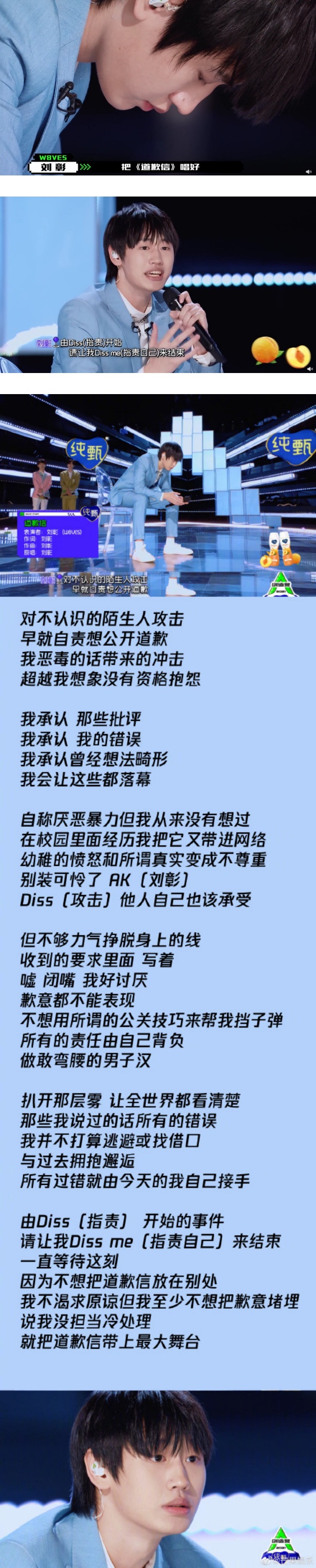 AK刘彰在节目中提到,自己踏上《创造营2021》的舞台最大的任务就是把《道歉信》这首歌唱好,“它代表着我跟过去的一些say bye bye。”