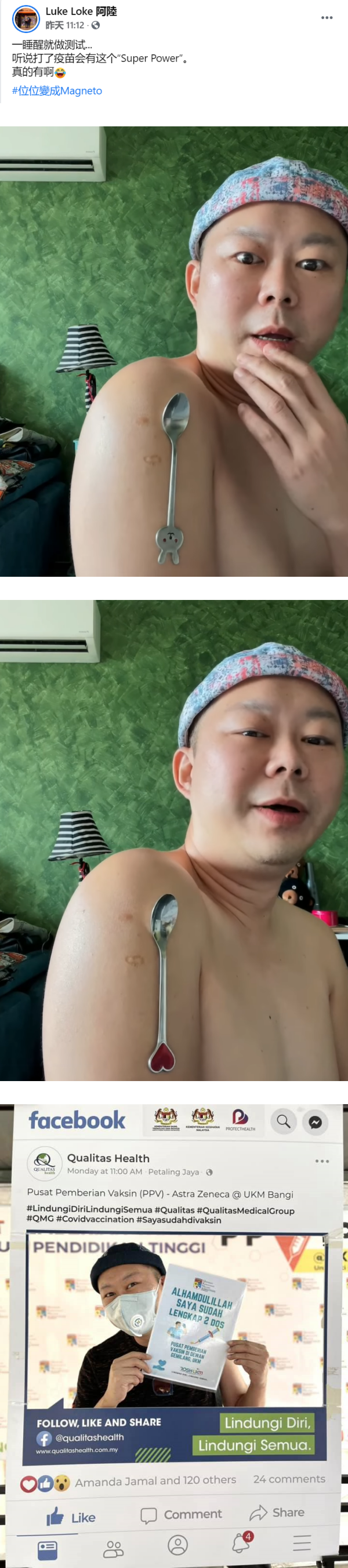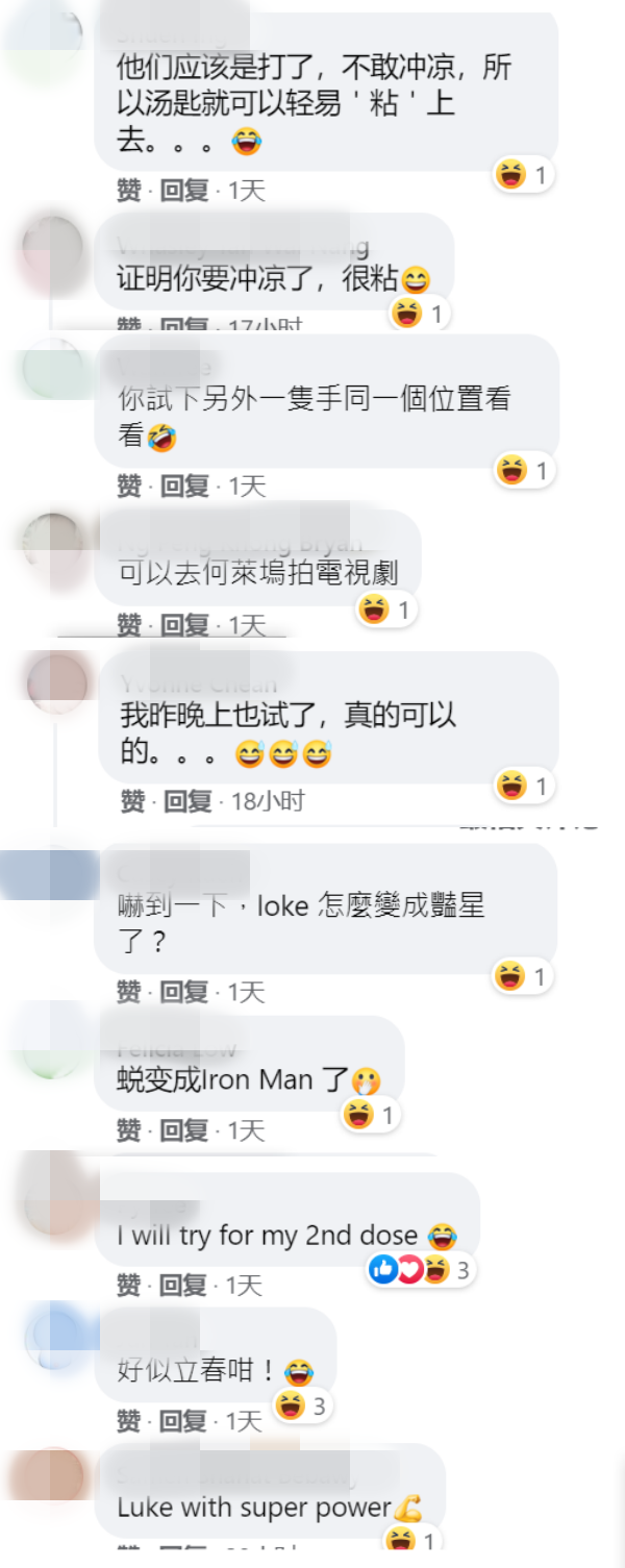 阿Luke变人体磁铁的视频曝光后,网友直呼,“我打第二剂的时候也要试”、“好像立春那样”、“Luke with super power”、“证明你要冲凉了,很粘”、“我昨晚也试了,真的可以”等。