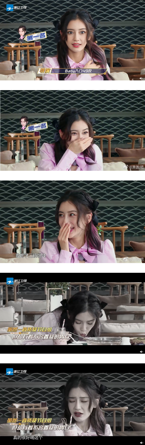 原来Angelababy低着头,一口气吃了3碗馄饨,随后还点了一杯大饮料来喝,吃着美食的同时不忘关心身边人吃的蛋挞是否好吃。相较于同场的女性周洁琼仅吃了5口食物,这对比之下Angelababy似乎吃得太好了。