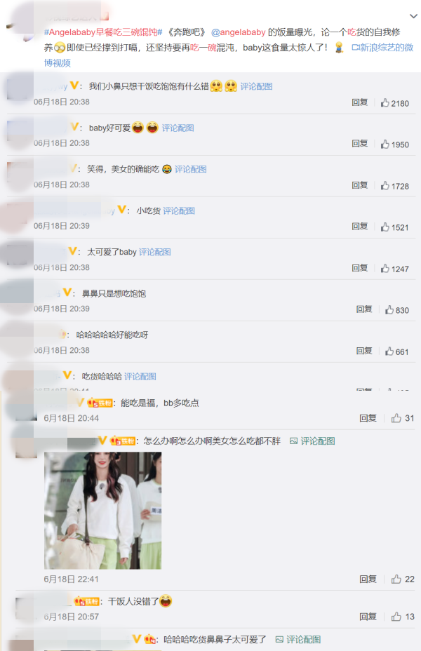 该片段在网上流传后,网友直呼,“笑得,美女的确能吃”、“论一个吃货的自我修养”、“能吃是福,bb多吃点”、“干饭人没错了”等。瞧Angelababy这般能吃,但她的官方体重仅维持在45KG,一点都不科学呀!