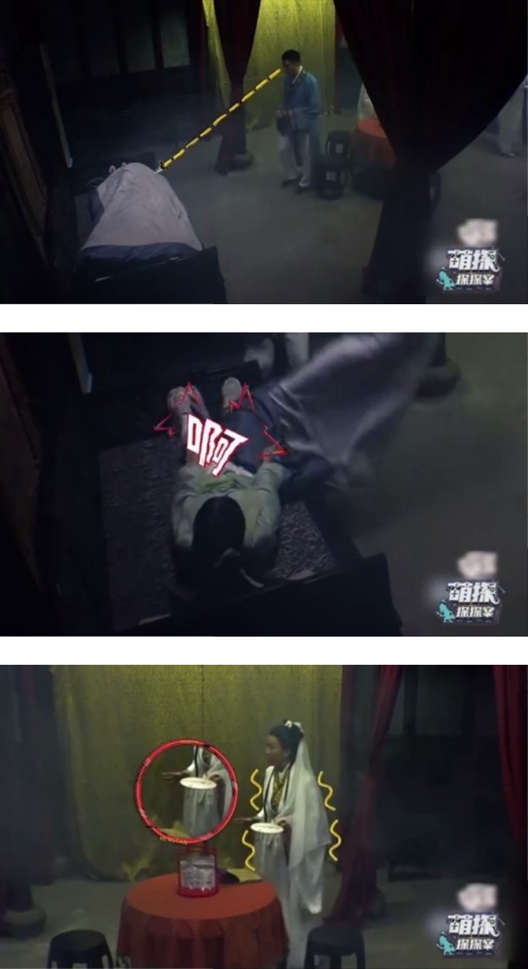 昨晚(2日)播出的《萌探探探案》中,Angelababy穿上古装扮演“青蛇”。当嘉宾们进入阴森的密室找铜钱时,Angelababy趁大家不注意,躺在床上用被遮住自己,待孙红雷掀开被子时,才跳起来大喊一声,吓得那英忍不住手抖、退后一步。