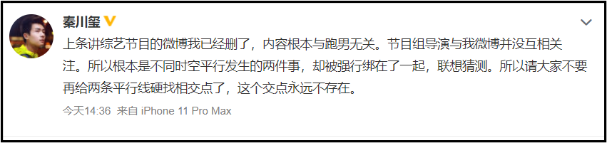 不过,在这件事登上热搜后,Angelababy的工作人员发文,否认内涵《跑男》节目组:“上条讲综艺节目的微博我已经删了,内容根本与跑男无关。节目组导演与我微博并没互相关注。所以根本是不同时空平行发生的两件事,却被强行绑在了一起,联想猜测。所以请大家不要再给两条平行线硬找相交点了,这个交点永远不存在。 ”