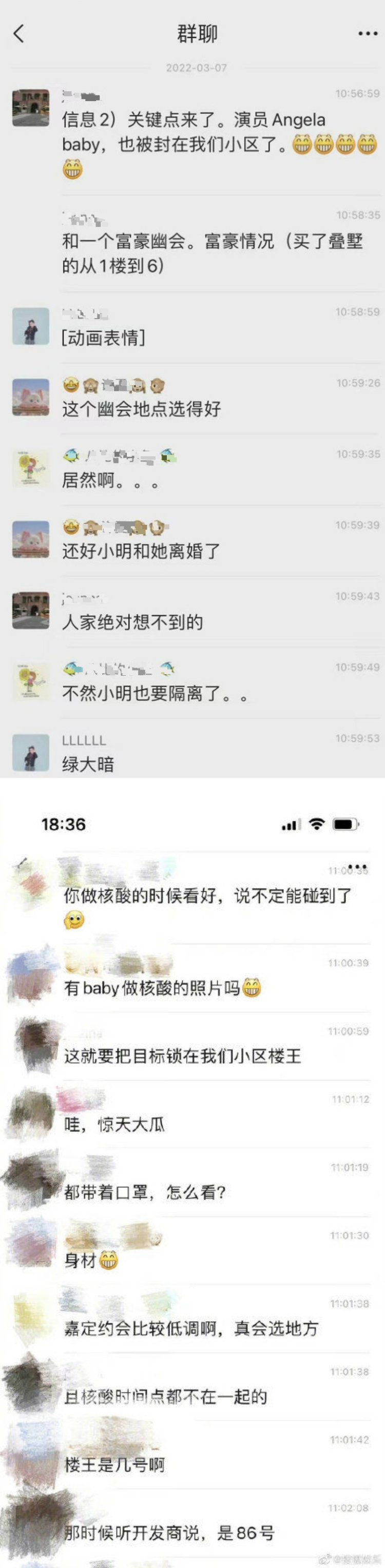 微博日前疯传一个群组内的聊天记录,内容称Angelababy在上海与一名富商约会,没想到小区内却出现确诊者,因此Angelababy也遭到强制隔离。网友还写道“还好小明和她离婚了”,疑似暗示Angelababy在离婚前就已和该名富商有往来。