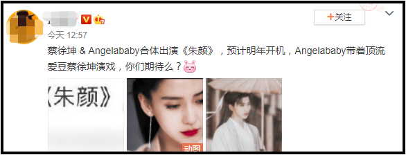 Angelababy即将搭档蔡徐坤,出演古装剧《朱颜》?