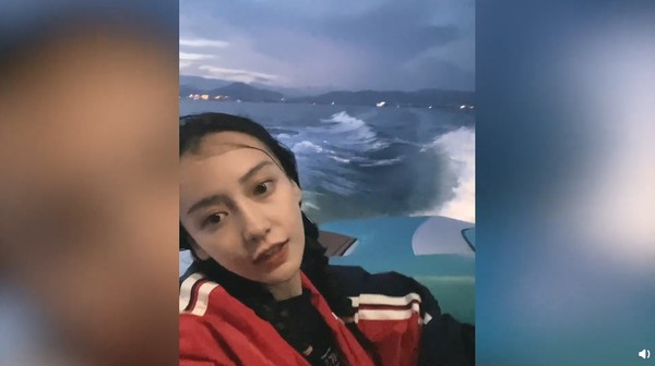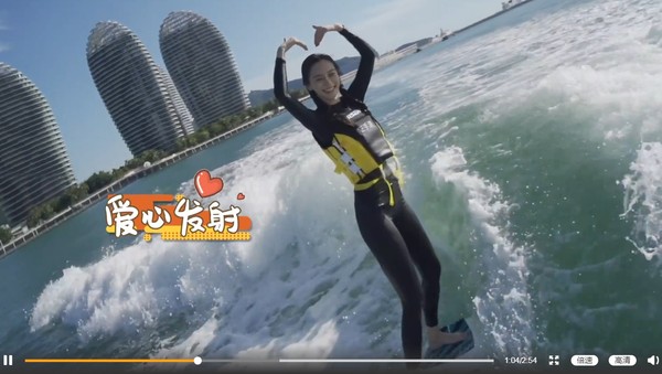 影片中,Angelababy穿着全副武装的冲浪装备,看起来驾轻就熟、得心应手,还对着镜头比爱心,没想到随后就翻车,摔下海里。
