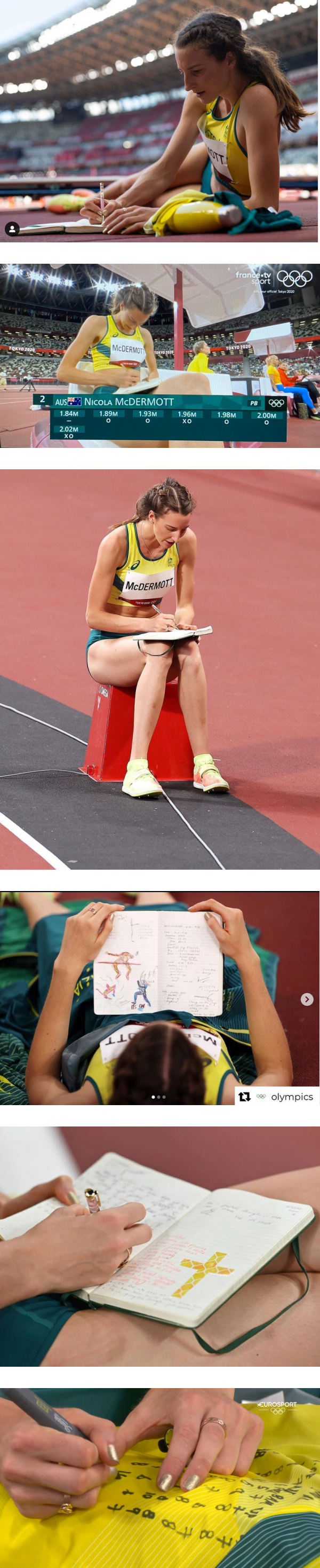 媒体发现这位澳洲跳高女将的笔记除了拥有满满的英文纪录之外,还有不少可爱的插画。即使有时在比赛中表现不如预期,一边伤心懊悔流泪的 Nicola McDermott 还是依然会坚持要写笔记,一边擦泪一边低头猛写,让观众们动容。