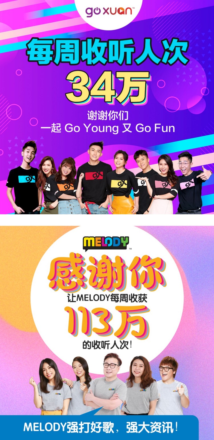Astro 电台的另一中文电台 MELODY 每周则吸引了 113 万听众捧场,表现也是出类拔萃。而值得一提的是,针对 00 后听众群的 GOXUAN 中文电台, 4 年来首次参与电台听众调查行列,并取得开门红,收获了每周 33 万 9 千人数佳绩。