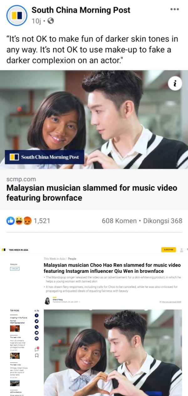 South China Morning Post报道提到,《白娃娃》MV里被涂黑女主角秋雯遭人欺负,后来使用了追求者朱浩仁送上的美白产品、防晒霜等后成功变白。