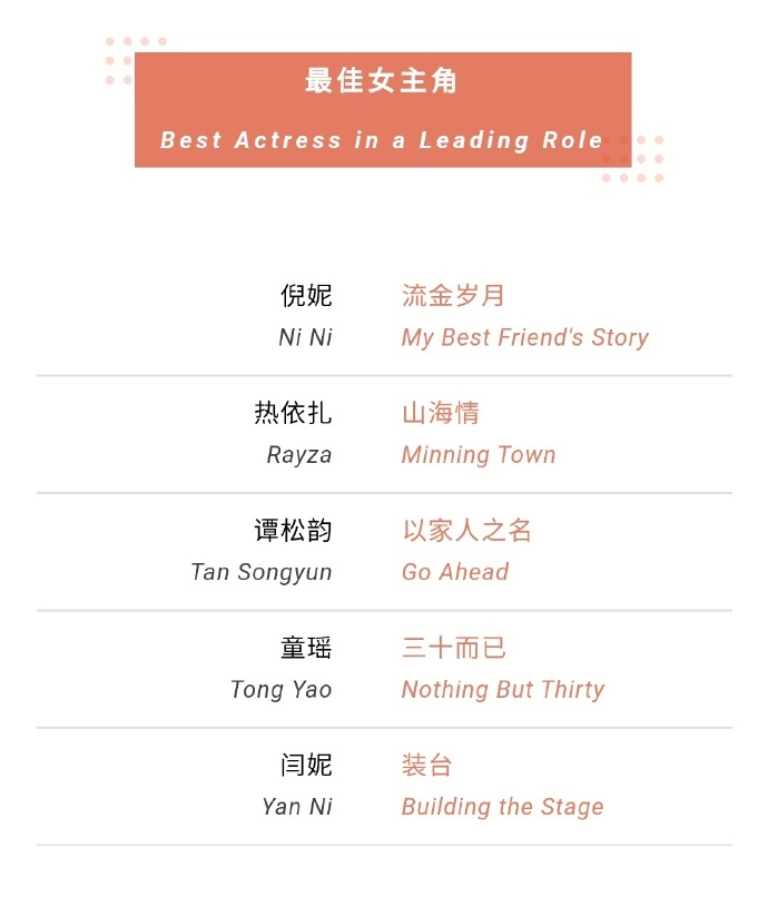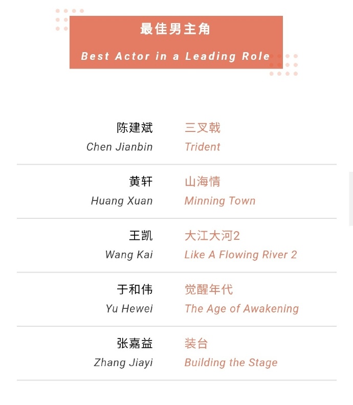 在最佳男主角方面则竞争激烈,入围的5人都是演技精湛的实力派,包括王凯、陈建斌、黄轩、于和伟和张嘉益。