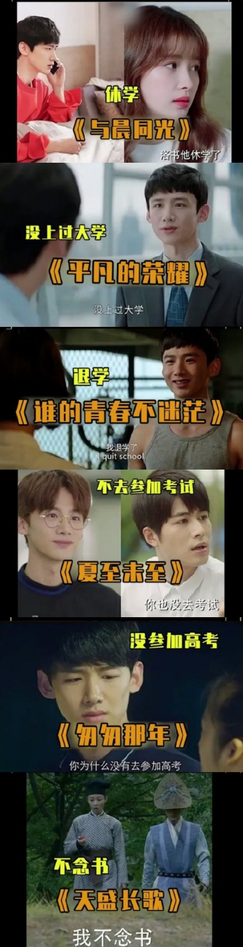 白敬亭在《与晨同光》中所饰演的李洛书是一名休学少年,其后有网友整理后发现,他近年来所饰演的角色,包括在《平凡的荣耀》、《谁的青春不迷茫》、《夏至未至》、《匆匆那年》、《天盛长歌》等剧中,几乎都是不读书、不考试,或是退学和休学的。