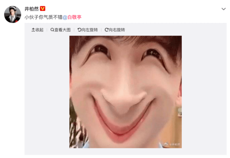 白敬亭昨天(20日)下午在抖音上传一段影片,只见他坐车经过井柏然的大型广告宣传牌,于是就边拍边用挑衅的语气念叨:“哎~小伙子气质看着一般啊”,没想到井柏然火速回应,在微博晒出白敬亭扭曲的表情包,回击:“小伙子你气质不错”。