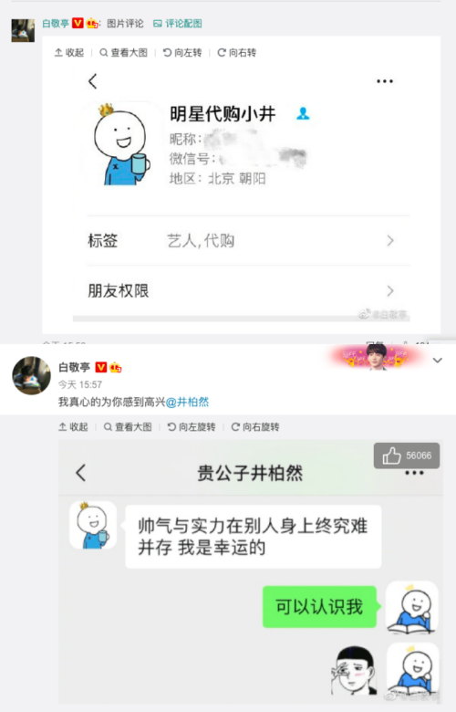 而白敬亭的回击也毫不手软,先是留言晒出井柏然的朋友圈简介,写着“明星代沟小井”,其后又发文贴出自己与井柏然的对话,配文:“我真心的为你感到高兴”,并艾特井柏然。