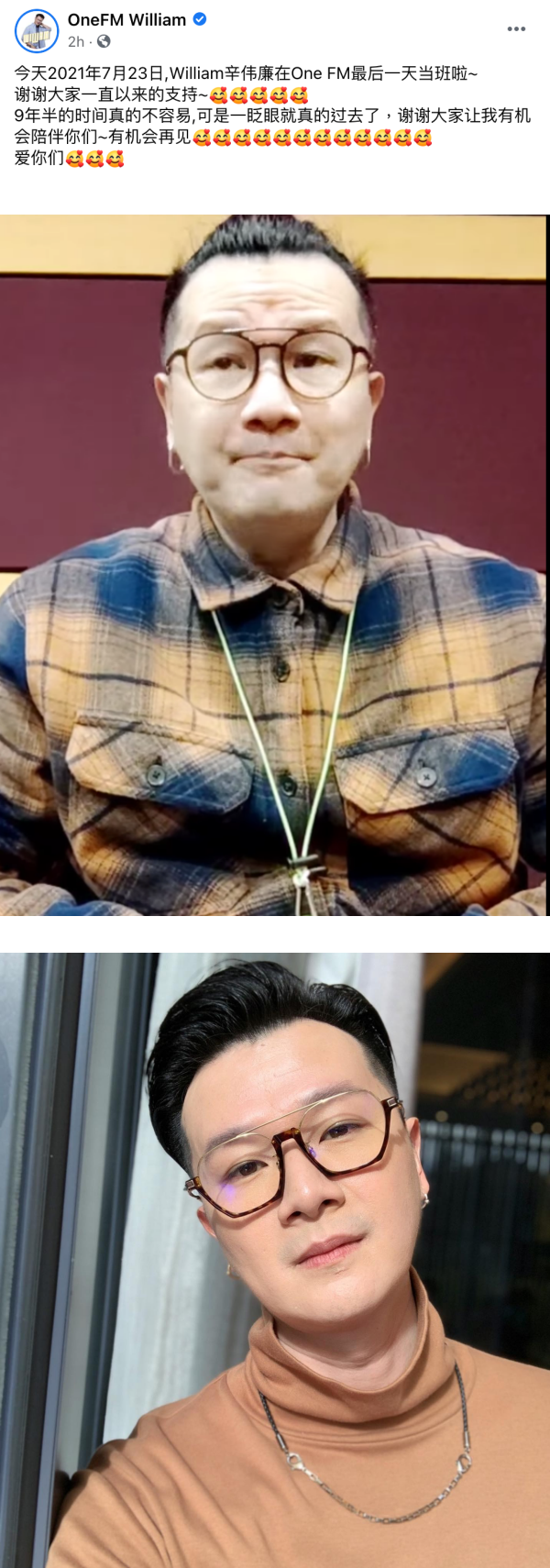 William 辛伟廉在今早毫无预警的在脸书上发布视频,宣布:“今天是我最后一天当班”,并感谢了在9年半以来所有听众们的支持,希望大家“江湖再见”。