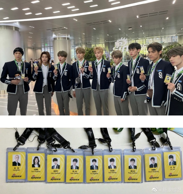 《青你3》第二次排位的前9名训练生——余景天、罗一舟、孙亦航、连淮伟、唐九洲、孙滢皓、段星星、梁森和刘隽,一起到《新浪》扫楼,众人乘坐巴士抵达后,在入口处握着职员卡拍照、打卡。