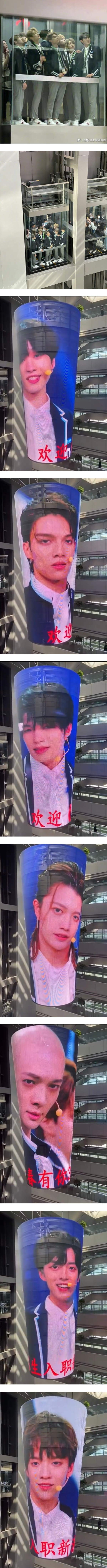 大伙儿挤进玻璃电梯期间纷纷被身后,这2根LED柱子给吸引住,为了欢迎《青你3》训练生,LED柱子上印上了训练生的样子,但也因为弧度问题,大伙儿的脸仿佛被拉扯、放大了一样。
