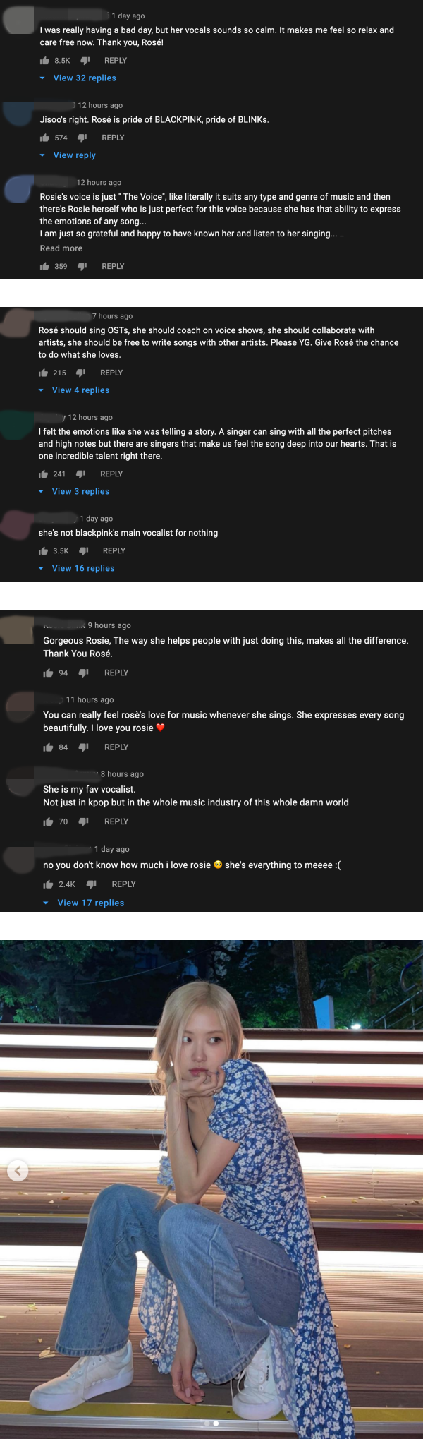 粉丝们纷纷留言:“我今天过得非常不顺,但是 ROSÉ的歌声让我觉得很平静,情绪舒缓了许多”、“ROSÉ绝对是BLACKPINK 的骄傲,BLINK 们的骄傲”、“ROSÉ 应该唱电视剧的OST ,给她这个机会吧”、“我觉得她的歌声就像在讲故事一样,超凡的才华,完全打进我们的心里” 等。