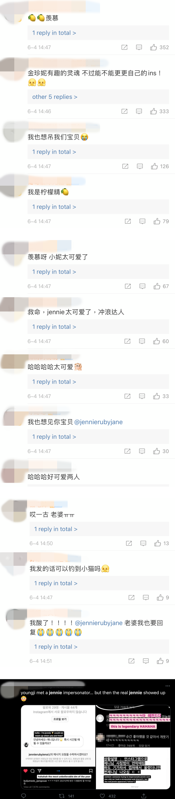 这则帖文在发出后马上引起了众多粉丝们的热议,甚至在微博及推特上广为流传。粉丝们看到消息后纷纷留言:“太羡慕了”、“我也想遇到JENNIE”、“原来这样做就可以遇到JENNIE 了”、“我马上用两个号去钓金珍妮” 等。