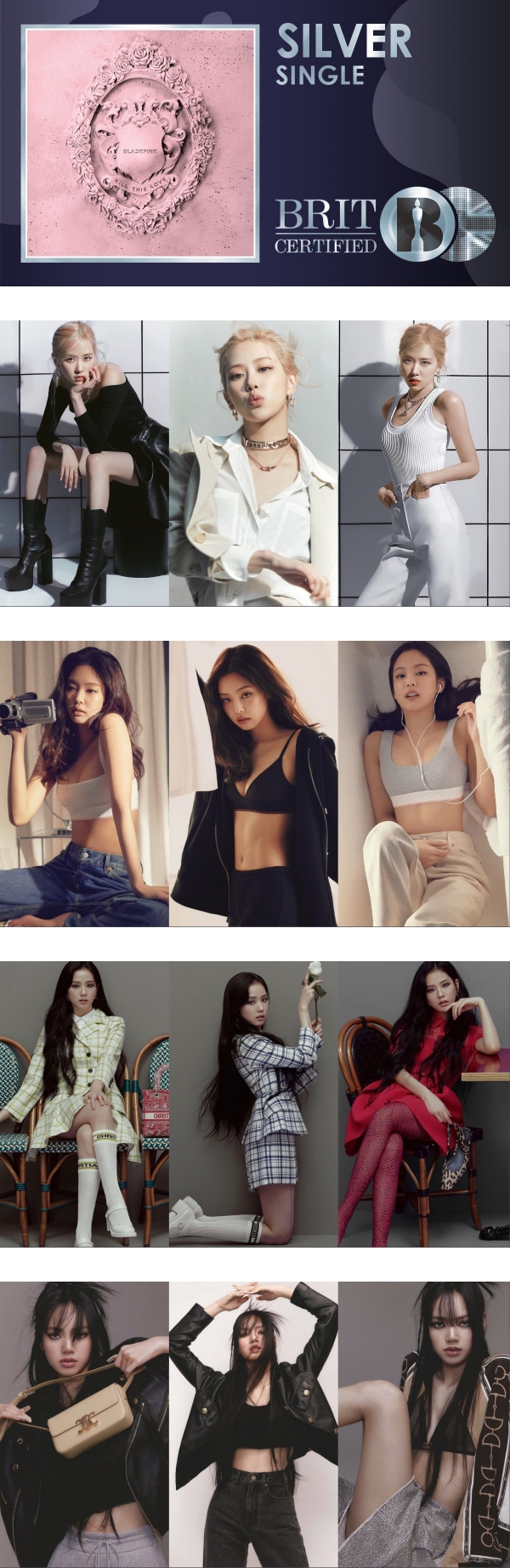 《Kill This Love》不只MV打破纪录,更是夺下了英国《BRIT CERTIFIED》售卖量第二高的歌曲,是韩国女艺人/团体之后中最多的一个。歌曲于2019年4月5日正式发行,是BLACKPINK 第二张迷你专辑的同名主打歌。这首MV 用了喇叭吹起前奏的震撼气势,四人组更在MV 中不断的变换造型,创造了韩国女团独树一帜的风格。