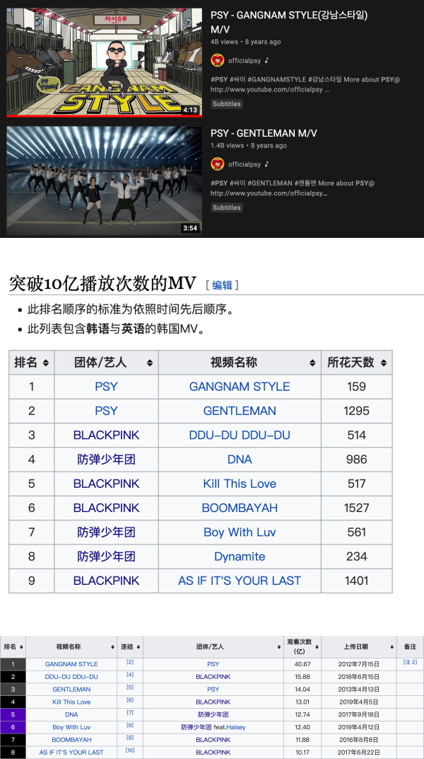 BLACKPINK 不只拥有所有韩团中观看次数最高的MV ,也是目前拥有最多破了13亿点击率MV的韩团,在全韩歌手中仅次于PSY 当年轰动一时的《Gangnam Style》和《Gentleman》的观看纪录。