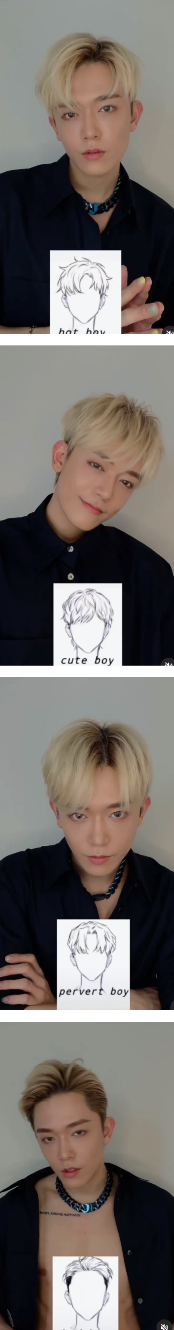 Brian See分别以齐刘海、中分、侧分以及大背头造型上镜,问网友:“告诉我,你喜欢哪种男孩?”视频中,他配合照片摆出各种姿势,比如“可爱男孩”就露出腼腆笑容、比爱心;到“坏男孩”部分,便将刘海梳上去,还脱了衣服!