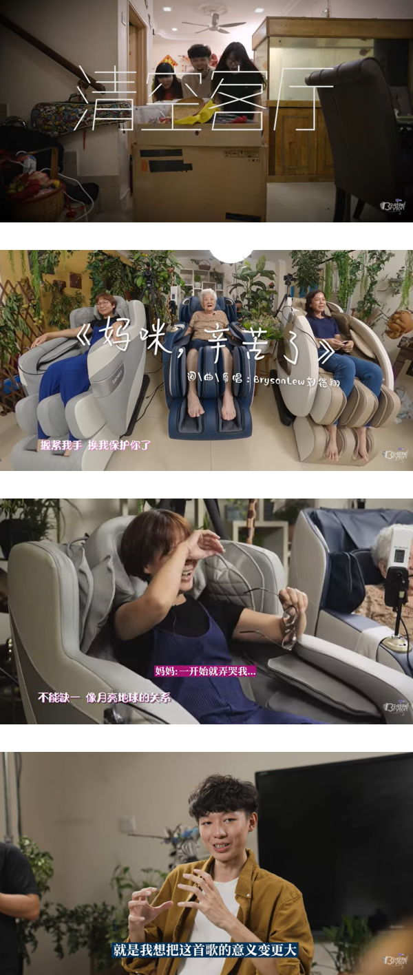 此次的创作,Bryson还特地找来了歌手Justin吴宗翰一起参与,来到拍摄当天Bryson安排了妈妈、奶奶和干妈先坐在按摩椅上享受一轮,随后再惊喜登场演唱《妈咪,辛苦了》一曲。Bryson妈妈看到儿子的用心,瞬间被感动落泪,“一开始就弄哭我!”;Bryson称,自己的个性不善于用言语表达自己的爱,于是选择把想要说的话都写成歌词,凭歌寄意献给最重要的三位女士。