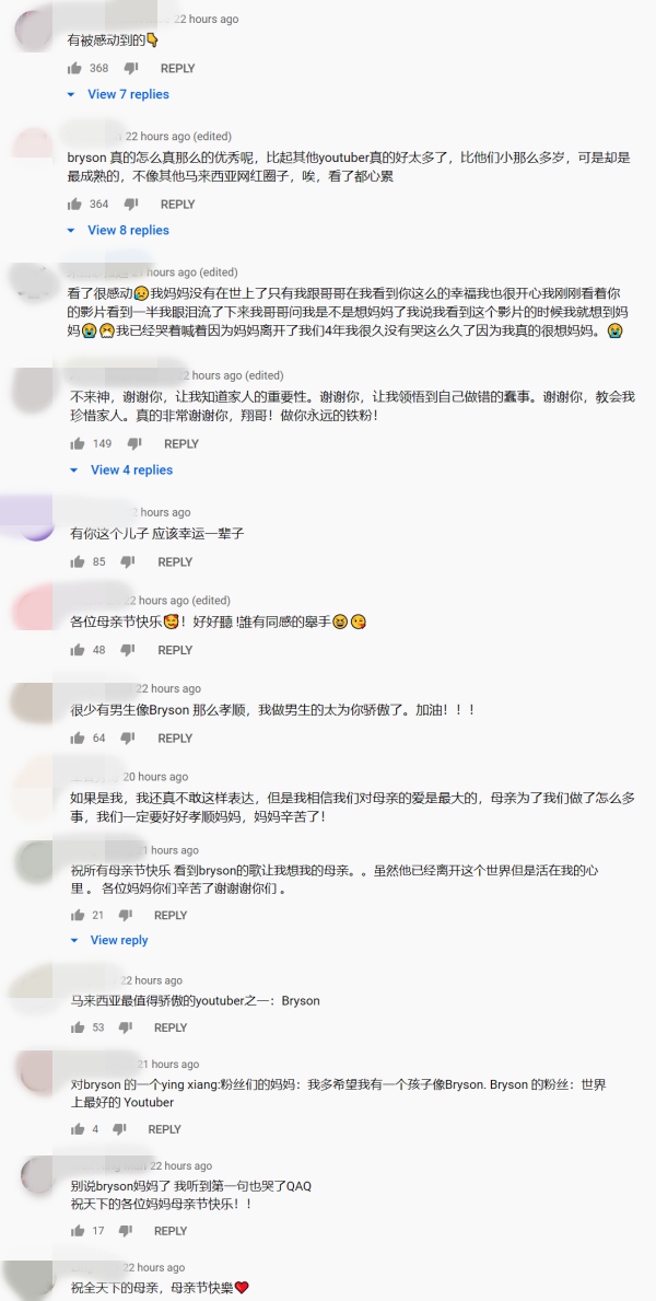 《妈咪,辛苦了》曝光至今在YouTube上已经累计约38万的点击率,网友也纷纷赞赏,“bryson 真的怎么真那么的优秀呢,比起其他youtuber真的好太多了”、“有被感动到”、“很少有男生像Bryson 那么孝顺”、“别说bryson妈妈了 我听到第一句也哭了”等。