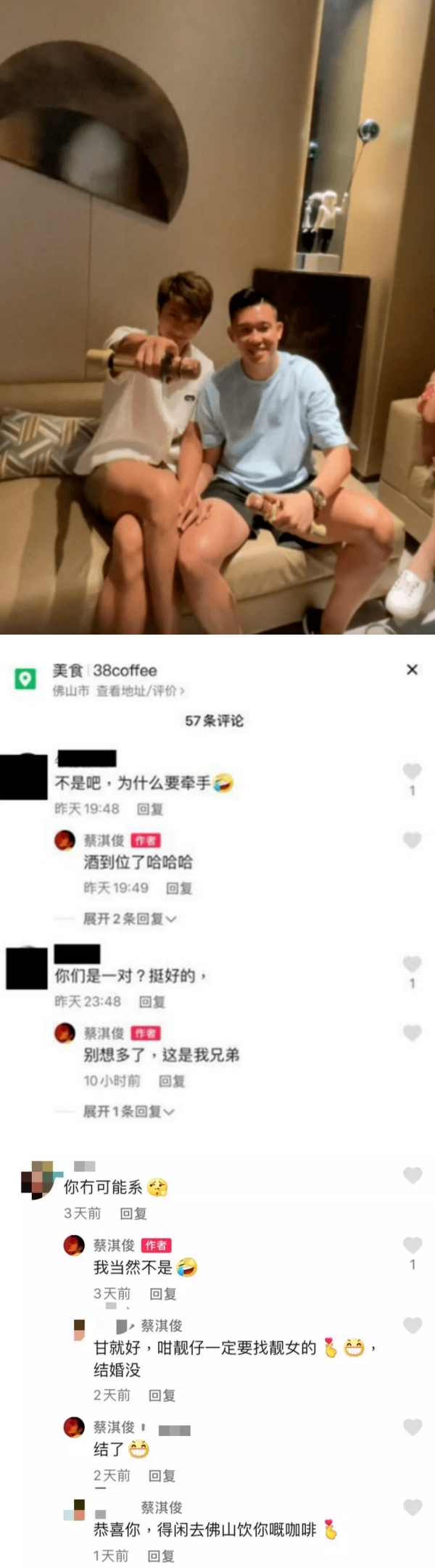 对于二人的亲昵行为,网友留言问:“为什么要牵手”、“你们是一对?”蔡淇俊坦言“酒到位了”,但强调和对方是兄弟。而有人问他是否已经结婚?蔡淇俊坦率回应:“结了”,彻底否认同性恋疑云。