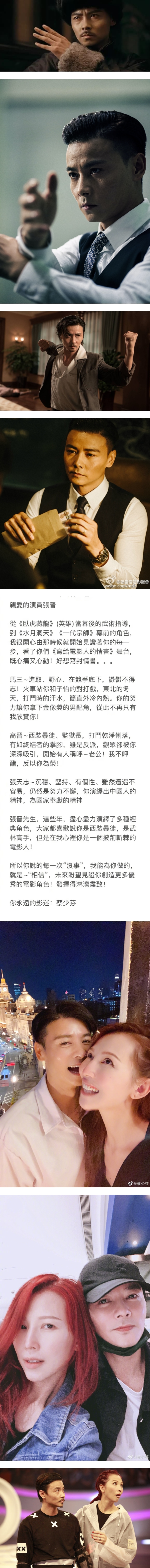 蔡少芬在比赛结束后于微博发出了“给电影人张晋的情书”,除了一一细数了张晋多年来的经典角色,包括获得香港金像奖的《一代宗师》的马三、《杀破狼》的高晋及《叶问》系列的张天志。不仅如此,她也在内文提及了你说的“没事”,我只有“相信”,情书的落款还是:你永远的影迷蔡少芬,让不少粉丝破防!